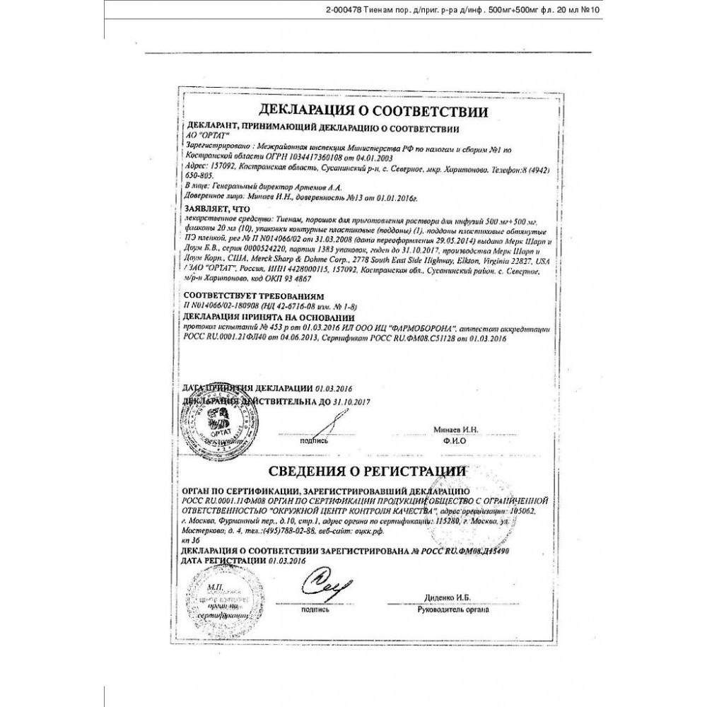 Для капельных введений разводят раствор тиенама в изотоническом растворе натрия хлорида или 5% растворе глюкозы.