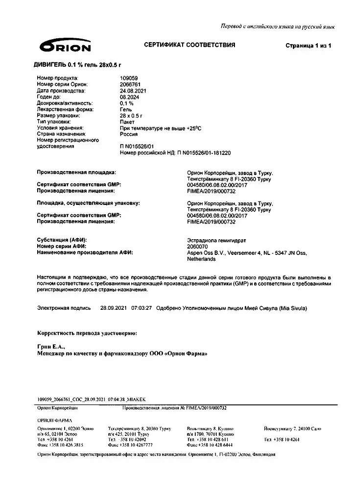 Препарат Дивигель представляет собой гель трансдермальный на спиртосодержащей основе. При нанесении на кожу спирт быстро испаряется и эстрадиол проникает через кожу, попадая в кровеносную систему. Нанесение препарата Дивигель на площадь 200-400 см2 (размер одной или двух ладоней) не влияет на количество абсорбированного эстрадиола. Однако если препарат Дивигель наносится на большую площадь, то степень всасывания значительно снижается. В некоторой степени эстрадиол задерживается в подкожных тканях, откуда происходит постепенное высвобождение его в кровяное русло.