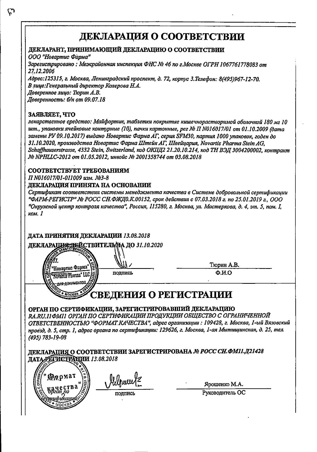 Влияние на способность управлять автотранспортом и работать с механизмами. Влияние приема препарата Майфортик® на способность управлять автотранспортом и механизмами не установлено. Механизм действия препарата Майфортик®, его фармакодинамические эффекты и зарегистрированные НЯ указывают на малую вероятность такого влияния. Тем не менее, следует предупреждать пациентов о возможных нежелательных явлениях препарата и необходимости соблюдать осторожность при работах, требующих концентрации внимания.