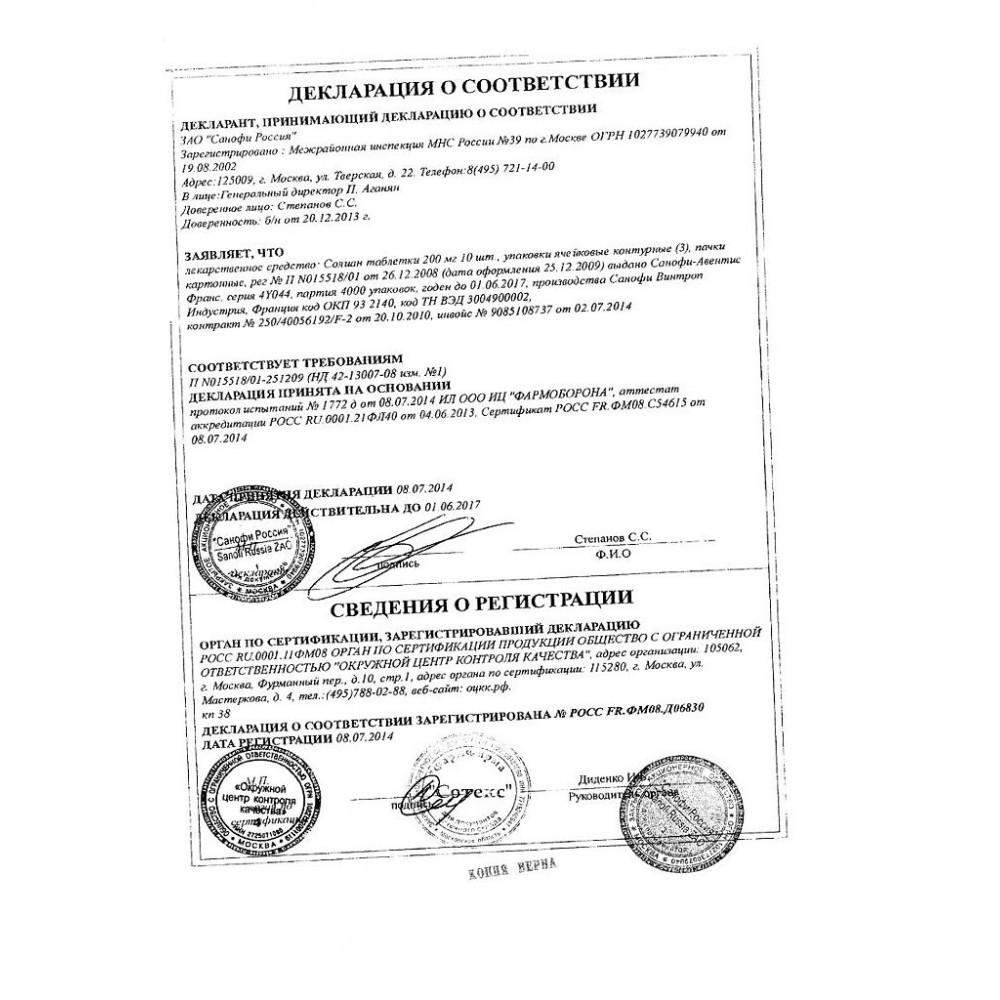Вспомогательные вещества: карбоксиметилцеллюлоза натрия (натрия амилопектина гликолат) (тип А) - 48 мг, лактозы моногидрат - 139.2 мг, целлюлоза микрокристаллическая - 72 мг, гипромеллоза - 13.6 мг, магния стеарат - 7.2 мг.