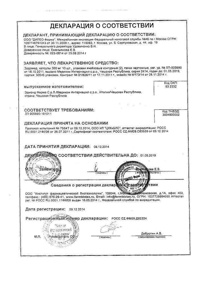 Показания. Рекомендуется использовать препарат в составе секретолитического лечения при острых и длительных заболеваниях верхних дыхательных путей, бронхов и легких, с нарушением секреции и транспорта слизи. Также допускается использование Эрдомеда в профилактике сезонных обострений длительного бронхита.