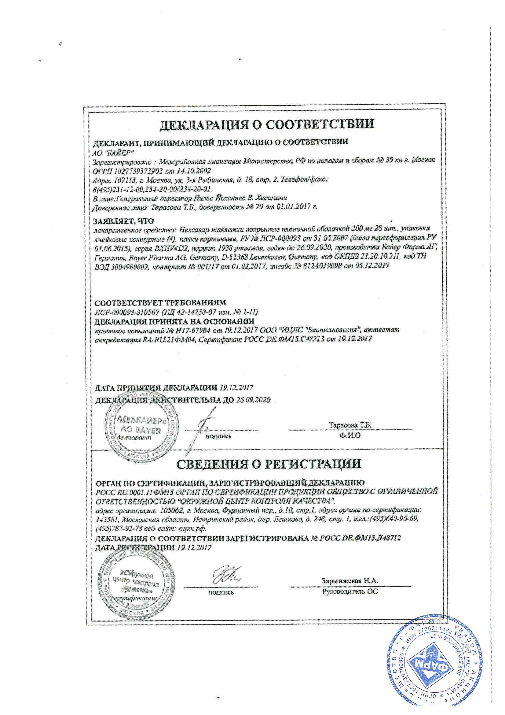 Применение. Таблетки Нексавар принимаются в промежутках между приемами пищи либо с нежирными продуктами. Рекомендуемая суточная доза составляет 800 мг (4 табл. по 200 мг). Суточная доза назначается в 2 приема (2 табл. 2 раза в сутки). Лечение продолжают до тех пор, пока сохраняется клиническая эффективность препарата Nexavar или до появления его неприемлемого токсического действия.