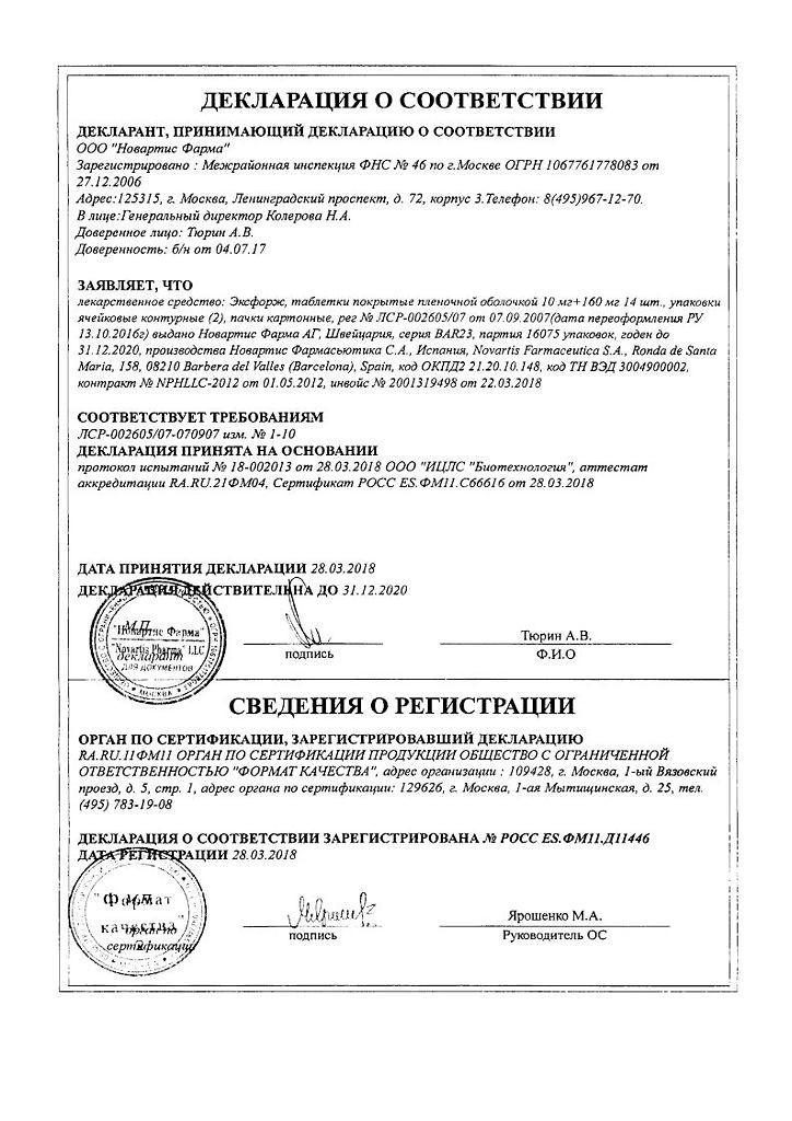 Эксфорж в дозе 10/160 мг нормализует АД у 78% больных с неадекватным контролем АД на фоне монотерапии амлодипином в дозе 10 мг. У больных с артериальной гипертензией при комбинации валсартана в дозе 160 мг с амлодипином в дозах 10 мг и 5 мг достигается дополнительное снижение систолического и диастолического АД на 6.0/4.8 мм рт.ст. и 3.9/2.9 мм рт.ст. соответственно, по сравнению с пациентами, которые продолжали получать только валсартан в дозе 160 мг или только амлодипин в дозе 5 и 10 мг.